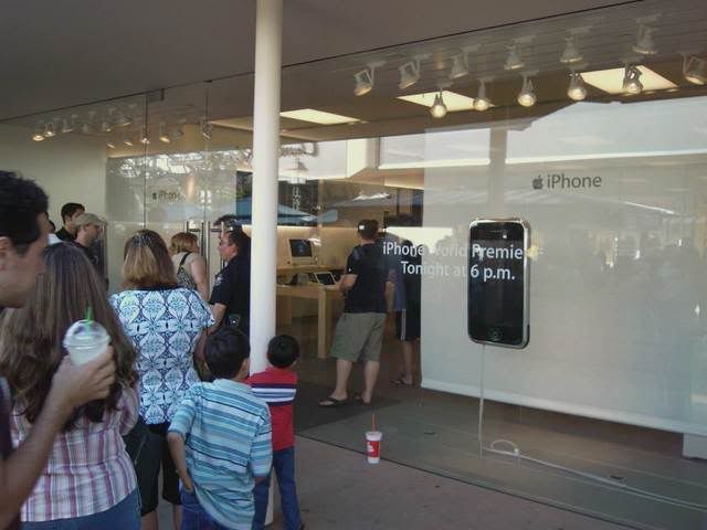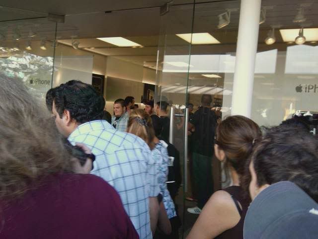 I decided to head over to my nearest Apple store after work tonight to witness the insanity that is the iPhone. There were already about 200 people in line at the store when I got there, and although I couldn't possibly afford one of those things, it was still interesting to stick around to watch the hoopla.
